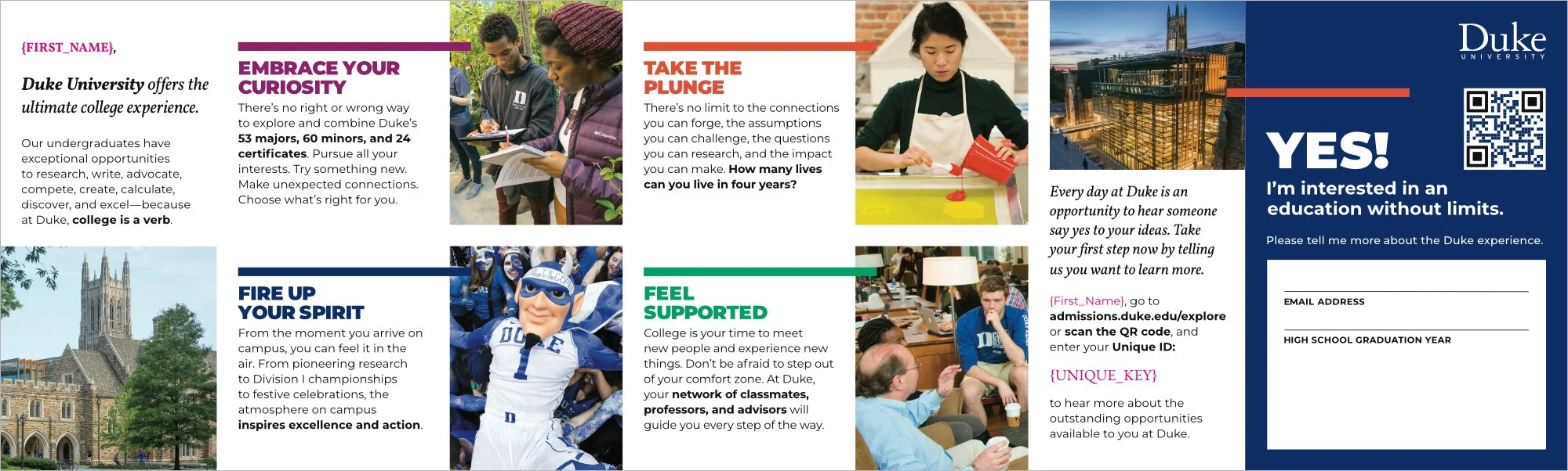 Duke University offers an exceptional liberal arts education to undergraduate students. As part of a comprehensive marketing campaign that included both print and digital elements, I was responsible for designing print materials aimed at attracting prospective high school students and keeping them engaged during the recruitment process. The initial print mailer was created to capture the students’ attention, while the follow-up piece reinforced key messages and maintained interest.