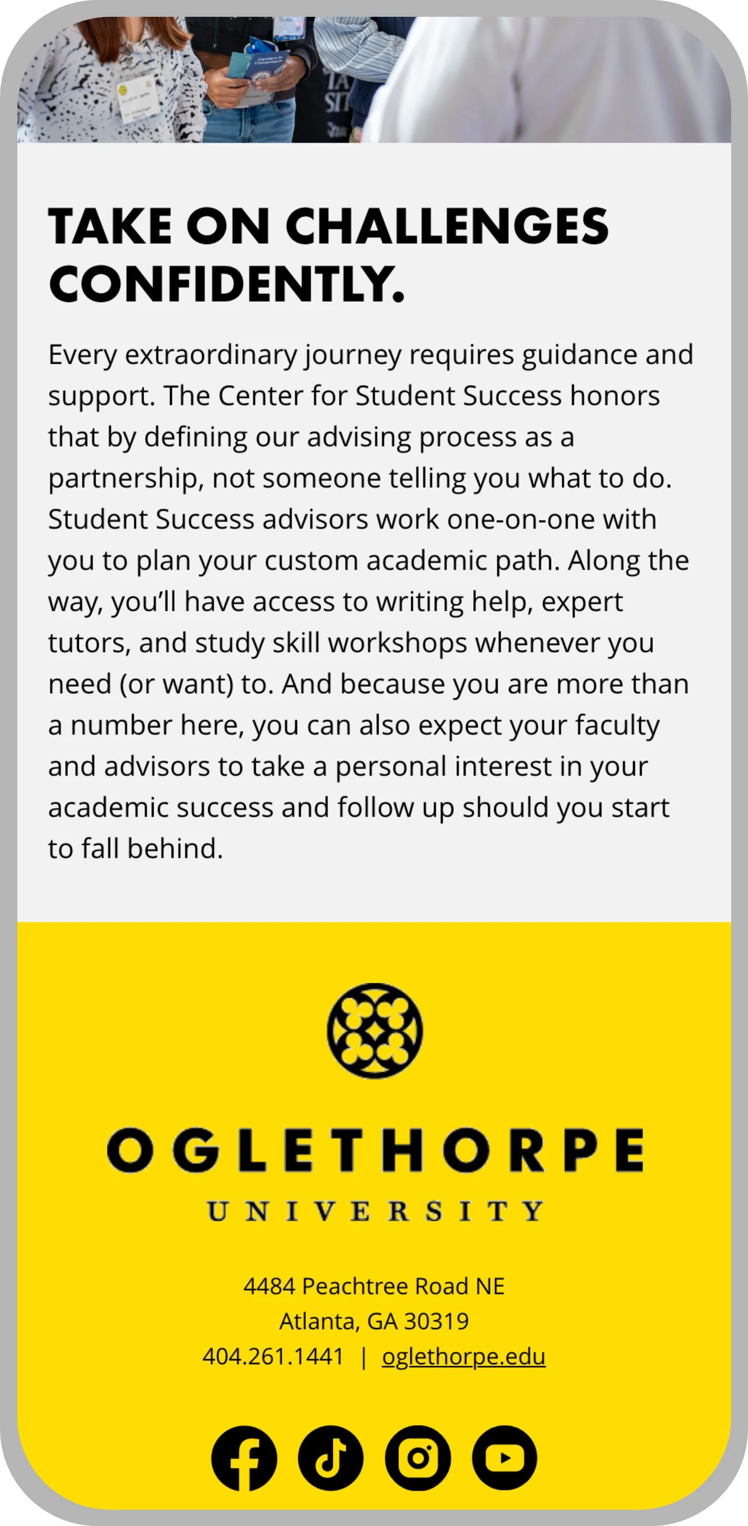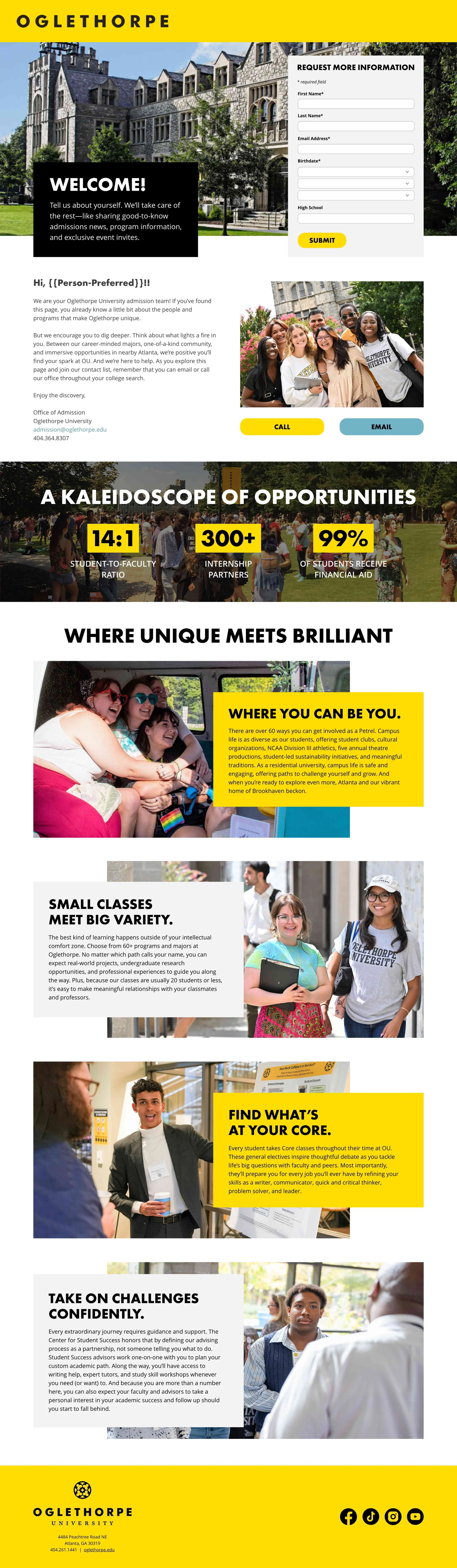 Oglethorpe University is recognized for offering Atlanta's leading undergraduate learning experience, characterized by a close-knit campus community and convenient access to big-city opportunities. As part of Oglethorpe's digital marketing campaign, my role involved creating visual designs for their web landing page and digital advertisements. The primary objective was to develop brand-consistent and visually-engaging designs aimed at attracting potential students throughout this comprehensive recruitment campaign.