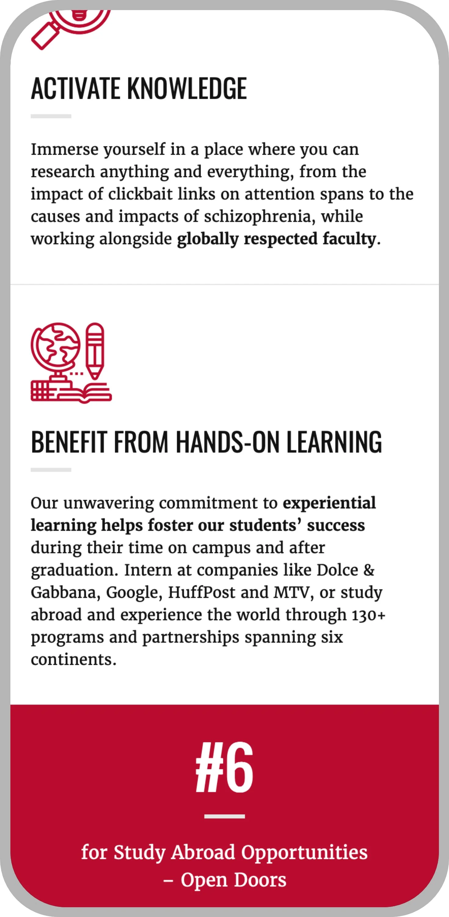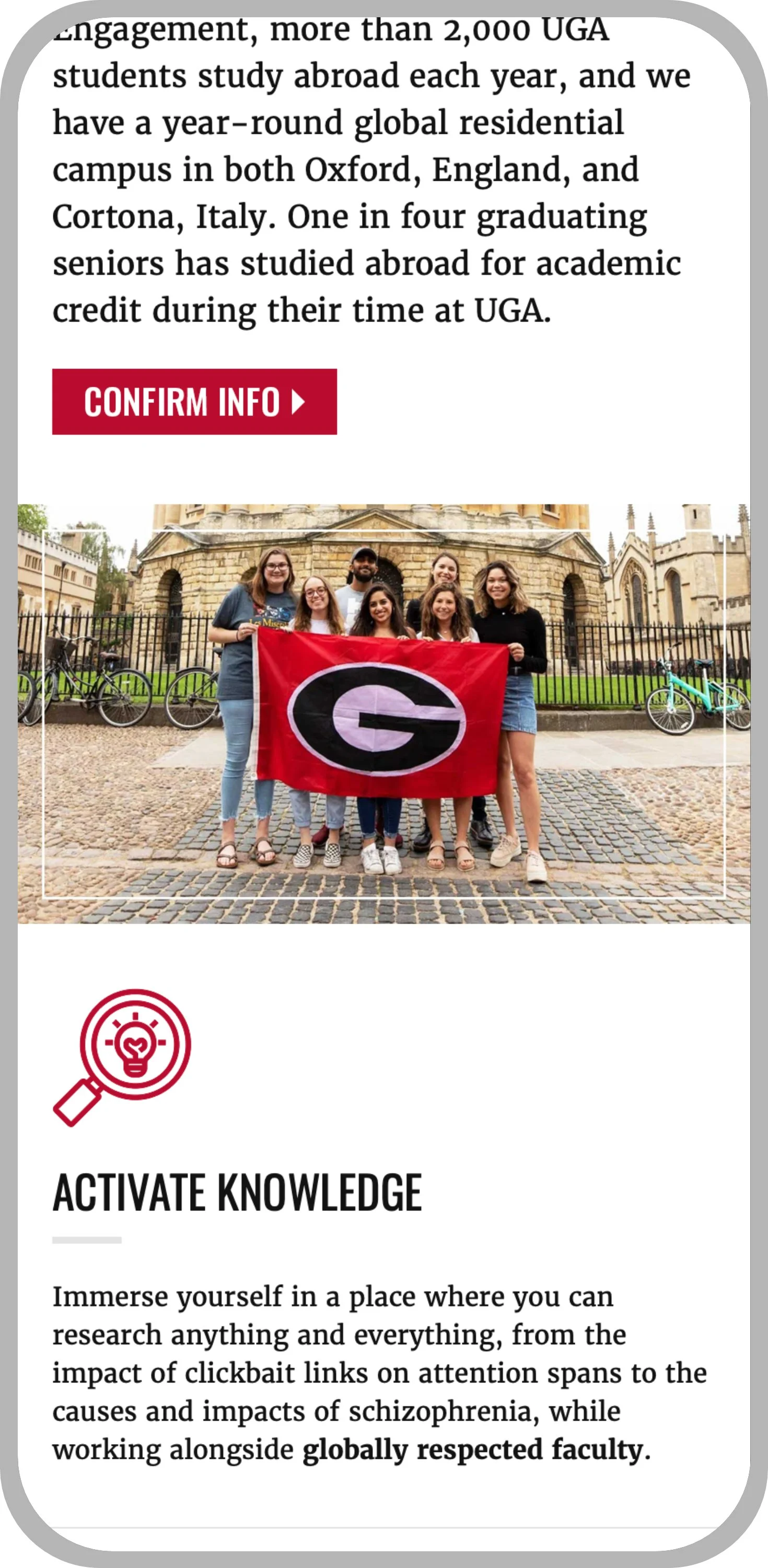 Founded in 1785, the University of Georgia is dedicated to enhancing the intellectual, cultural, and environmental legacy of both the state and the nation by providing an exceptional education and working towards a brighter future. For this marketing campaign, I collaborated with UGA’s admissions team to ensure that the campaign's design accurately reflected their overall brand. My role involved creating the visual design for all their emails and the web landing page, as well as building and coding each element. Through extensive testing, I made sure that the mobile-friendly components looked solid across all email clients and web browsers.